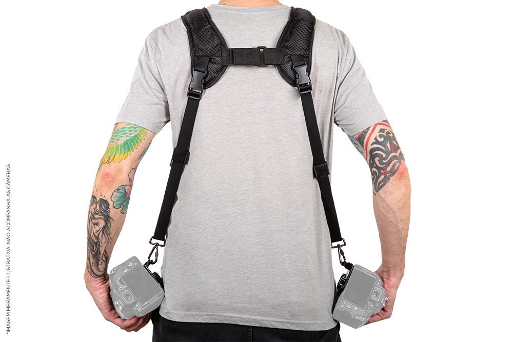- Ajustável: Possuí regulagem de altura e limitador para deixar a câmera parada, à frente do corpo, ou mais relaxada, para trás; - Proteção: Aumenta a segurança no uso da câmera com a alça de ombro; - Ergonomia: sua DSLR ficará segura ao ombro deslizando ao longo da alça, mas próxima ao seu tronco; - Agilidade: Tenha maior flexibilidade e precisão no trabalho; - Prática: Fácil instalação; Fixação na alça por engate rápido (mosquetão) encaixado na câmera; - Universal: Compatível com qualquer câmera ou lente com rosca de 1/4"; - Profissionalismo: Evite desconforto "enroscando" a alça de pescoço no pulso ou na mão; - Durável: Material resistente e de fácil limpeza/lavagem; - Qualidade: Alça em nylon com ótima malha de qualidade e agradável ao manuseio; - Conforto: O peso de sua câmera é distribuído uniformemente para o máximo em conforto, acolchoado garantindo longo tempo de clicks sem incomodar; - Material: É construída de nylon balístico de extrema durabilidade;