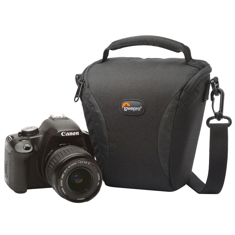 Este belo modelo da Lowepro é perfeito para armazenar uma câmera DSLR com lente acoplada ou super zoom. Além disso, tem compartimentos para os acessórios e alças de mão e tiracolo.