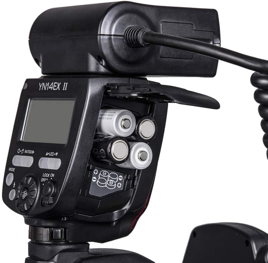 YN14EXII está equipado com tomada de alimentação externa, que atende às demandas do usuário de tempo de reciclagem de alta velocidade. O tempo de reciclagem de saída total é de apenas 3 segundos, você pode obter uma experiência de reciclagem de alta velocidade dentro de 4 a 5 segundos, mesmo quando não estiver usando baterias novas.