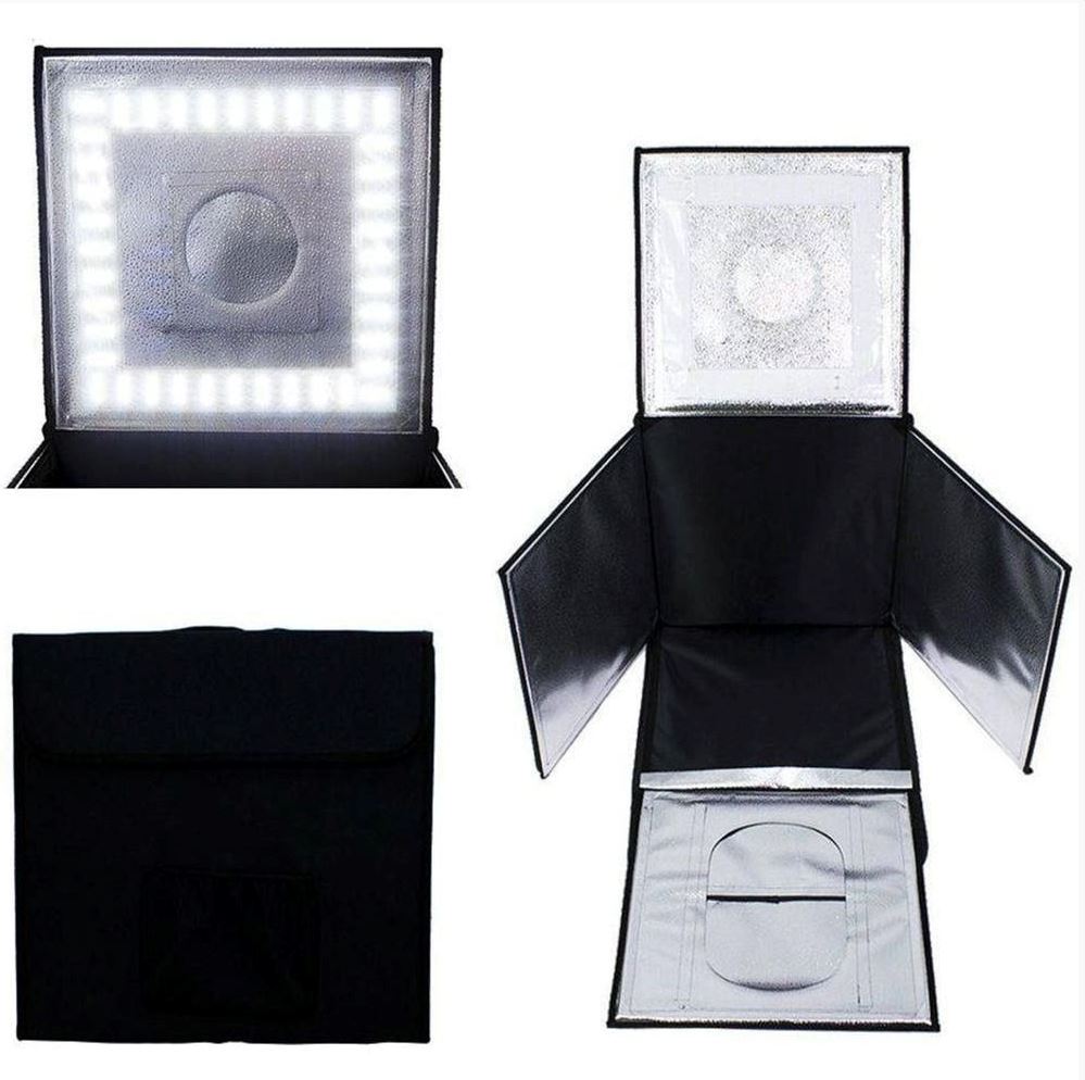 Caixa com paredes internas refletoras (40x40x40cm). Acompanha placa de LED com 120 lâmpadas total de 50W.
