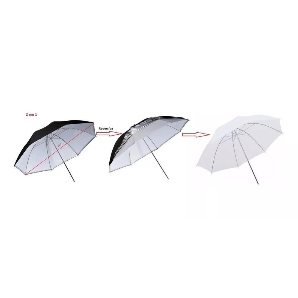 Sombrinha para uso em estúdio fotográfico Tecido dupla face branco e prata e preto removível Material: hastes em metal com cobertura em triplo tecido de nylon nas cores branco, preto e prata 84cm de diâmetro Uso profissional